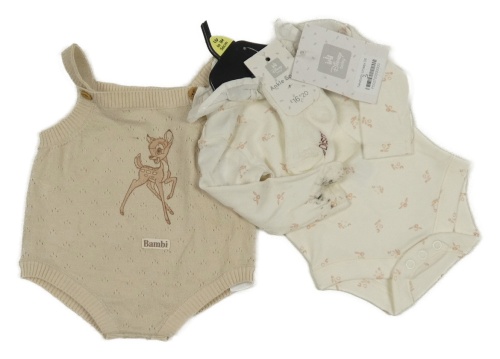 Nové - 3Set - Světlebéžové perforované úpletové laclové kraťasy s Bambim + bílé body s kytičkami a volánkem a ponožky Disney
