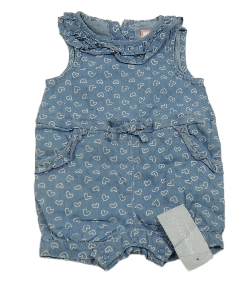 • Nové - modrý lehký riflový kraťasový overal se srdíčky a mašlí a volánky early days