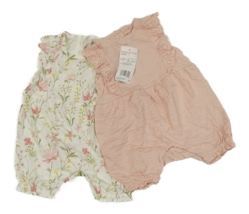 Nové - 2x - Kraťasový overal s volánky - Bílý s kytičkami, světlerůžový žebrovaný s 3D puntíky F&F