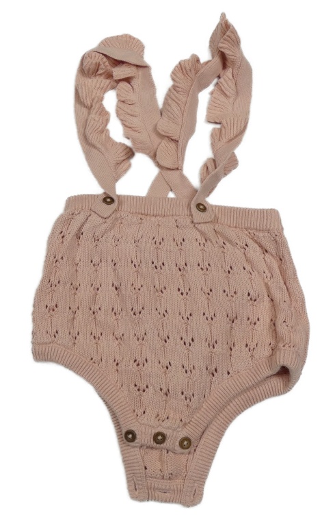 Pudrové ažurové pletené kraťasy s kšandami s volánky