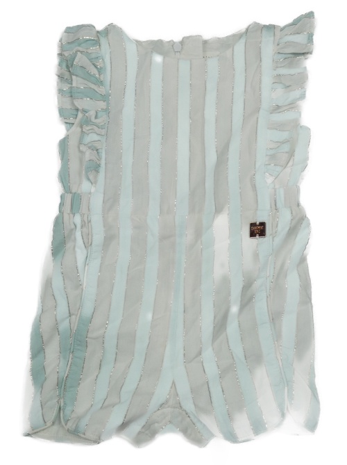 Bílo-světlemodrý pruhovaný kraťasový overal s volánky