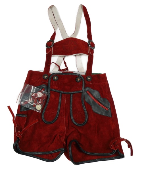 • Nové - karmínovo-tmavošedé semišovo/koženkové kraťasy s kšandami KITZO ALPEN