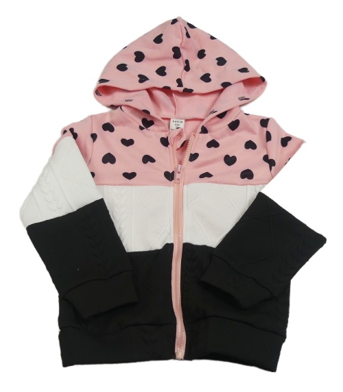 Růžovo-bílo-černá vzorovaná propínací mikina se srdíčky a kapucí SHEIN