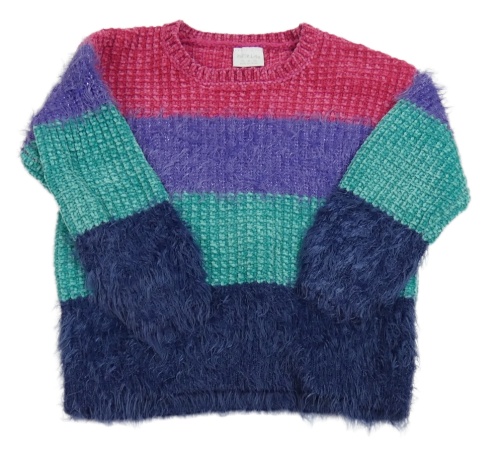 Růžovo-fialovo-zelný pruhovaný žinylkový/chlupatý svetr F&F