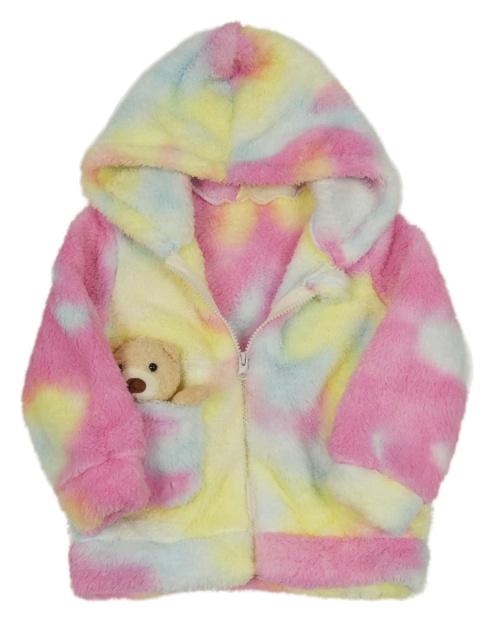 2 set - růžovo-žlutá chlupatá propínací mikina s kapucí + plyšový medvídek