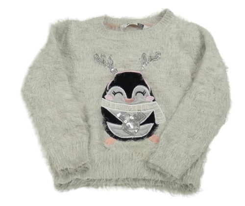 Šedý chlupatý svetr s tučňákem a flitry Pep&Co