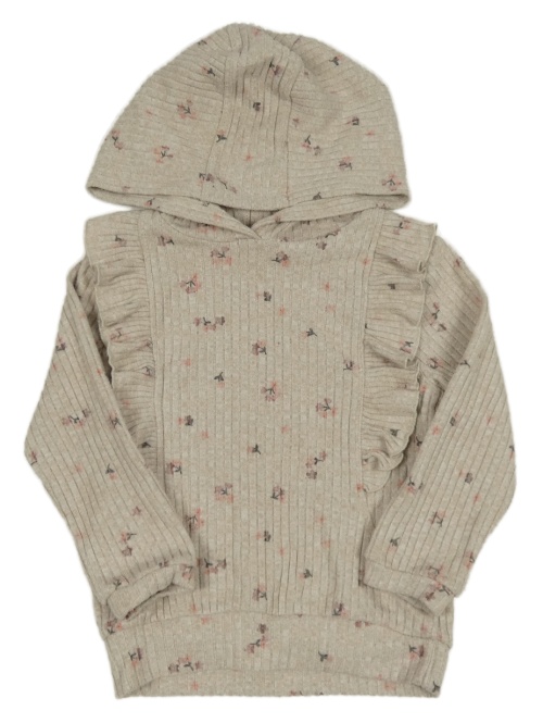 Béžová melírovaná žebrovaná úpletová mikina s kytičkami a volánky a kapucí C&A