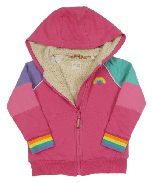 Růžovo-barevná zateplená propínací mikina s duhou a kapucí