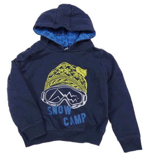 • Tmavomodrá mikina s tištěnou čepicí a lyžařskými brýlemi a nápisy a kapucí lupilu