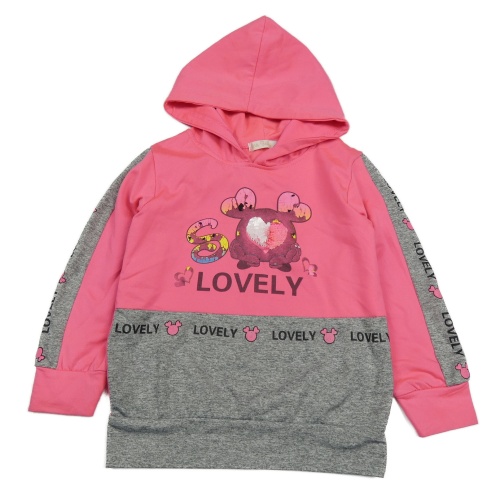 • Křiklavě růžovo-šedá/melírovaná mikina s nápisy a srdíčkem z překlápěcích flitrů a kapucí