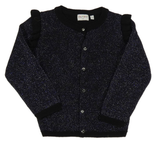 Černo-tmavofialovo-zlatý třpytivý propínací svetr s volánky
