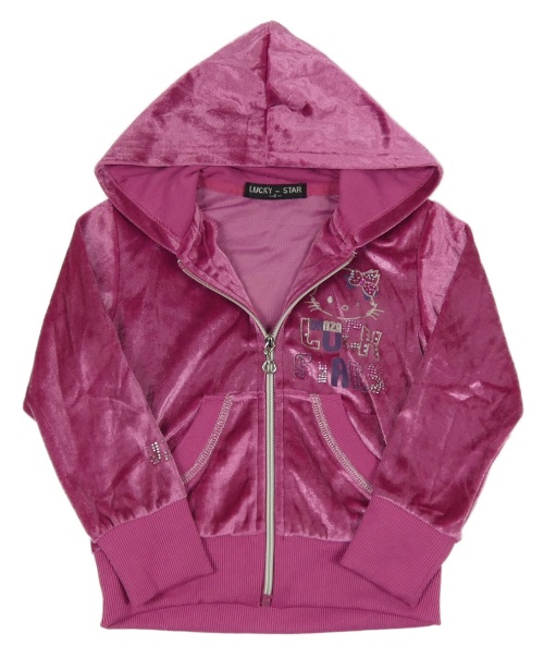 Malinová lesklá sametová propínací mikina s kočičkou a kamínky a kapucí