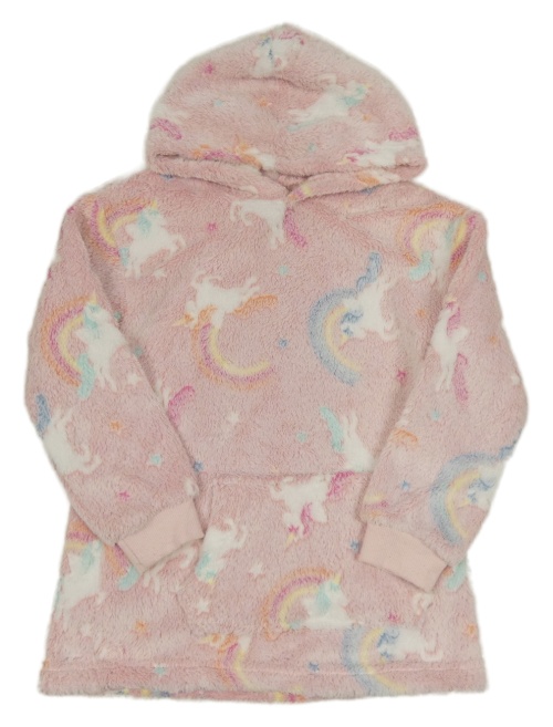 Světlerůžová plyšová oversize mikina s jednorožci a kapucí