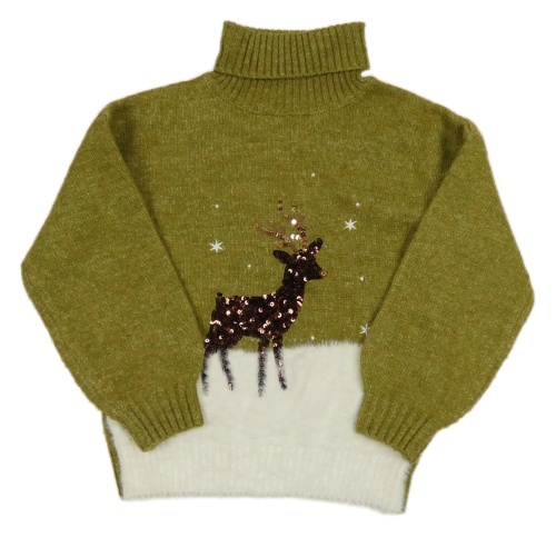 Khaki-bílý svetrový rolák se sobem z flitrů Tu