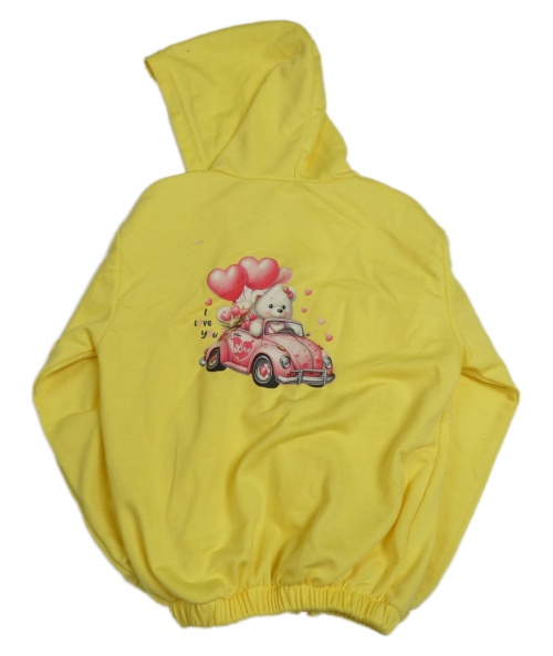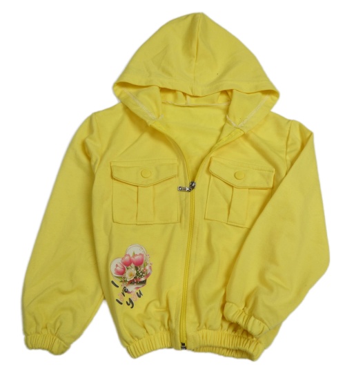 Žlutá propínací mikina se srdíčkem s tulipánky a autíčkem a medvídkem a kapucí