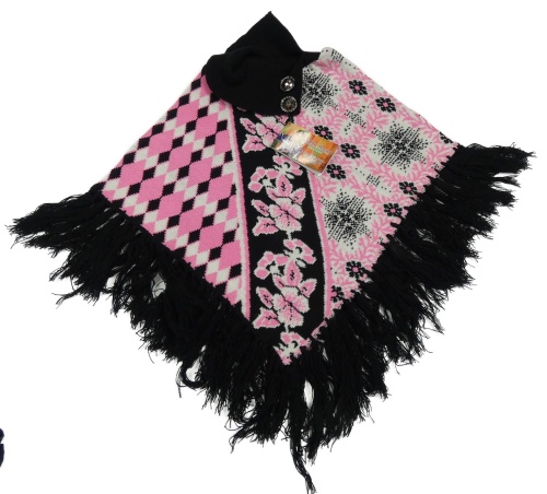 Nové - Černo-bílo-růžové vzorované pletené pončo s rolákem a třásněmi