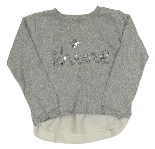 Šedý melírovaný svetr s nápisem z flitrů a třpytkami a šifonovým volánkem PRIMARK