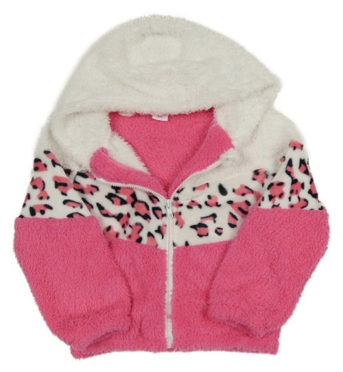 Bílo-růžovo-černá chlupatá propínací mikina s leopardí vzorem a kapucí