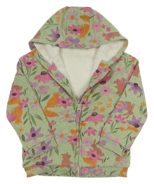 Světlezelená vzorovaná propínací zateplená mikina s kytičkami a zvířátky a kapucí Nutmeg