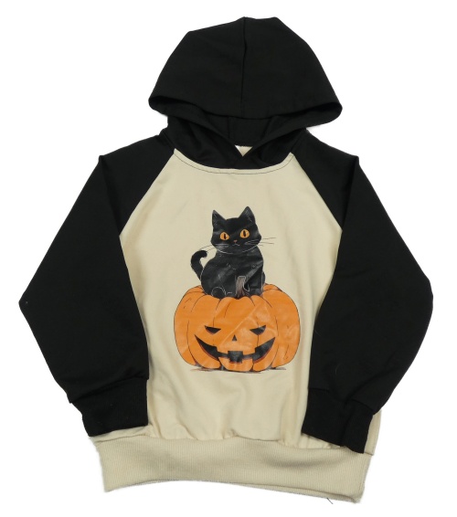 Světlebéžovo-černá mikina s dýní a kočičkou a kapucí