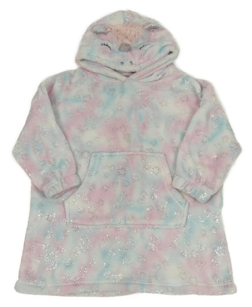Světlemodro-růžovo-bílá batikovaná chlupatá oversize mikina s kapucí - jednorožec Nutmeg