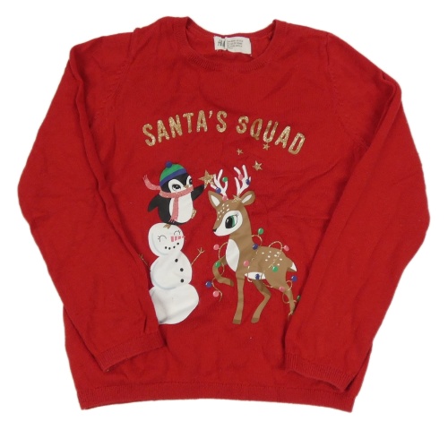 Červený vánoční svetr se zvířátky a sněhuláčkem a zlatým nápisem H&M