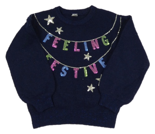 Tmavomodrý svetr s nápisem z flitrů TU