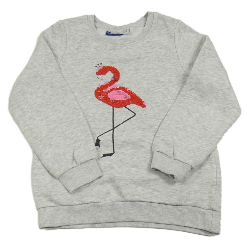 Světlešedá melírovaná mikina s plameňákem s překlápěcími flitry lupilu