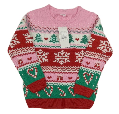 Nové - růžovo-bílo-červeno-zelený vzorovaný pletený vánoční svetr s obrázky little kids