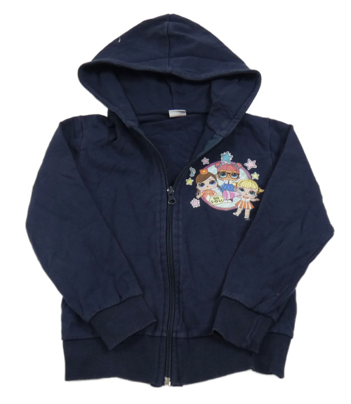 Tmavomodrá propínací mikina s L.O.L. a kapucí