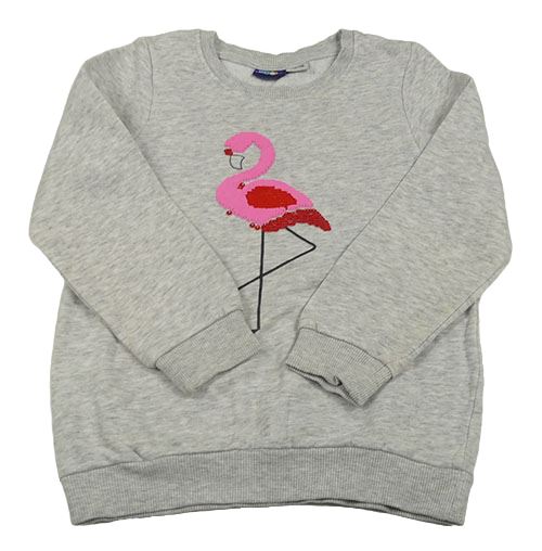 Světlešedá melírovaná mikina s plameňákem s překlápěcími flitry lupilu