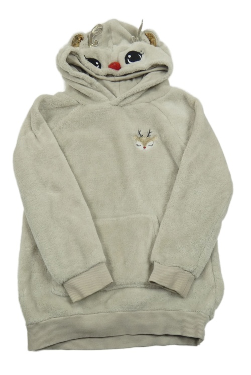 Světlešedobéžová plyšová dlouhá mikina se sobem a kapsou a kapucí H&M