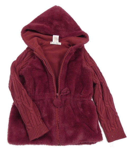 Vínový zateplený svetr s kožešinovými prvky a kapucí