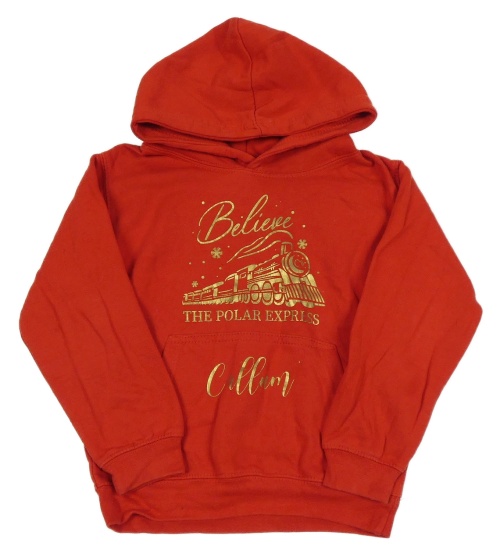 Červená mikina se zlatým potiskem a kapucí