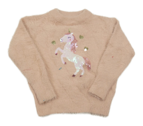 Starorůžový chlupatý svetr s jednorožcem z flitrů C&A