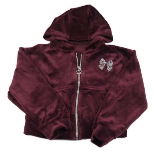 Švestková sametová propínací crop mikina s mašličkou a kapucí Nutmeg