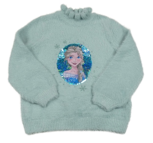 Zelený třpytivý chlupatý svetr s Elsou a překlápěcími flitry C&A