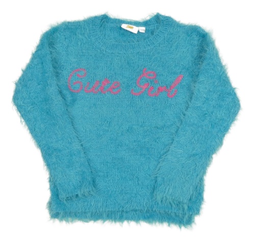 Azurový chlupatý svetr s nápisem z flitrů Kids