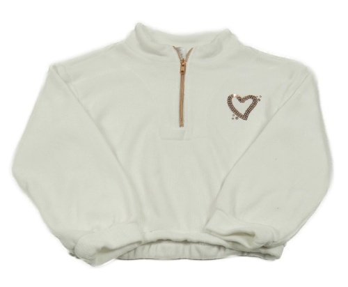 Bílý žinylkový svetr se srdcem z flitrů