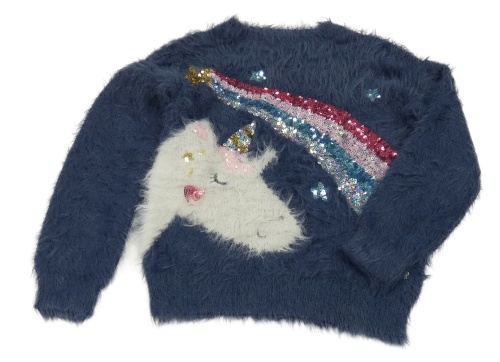 Tmavomodrý chlupatý svetr s jednorožcem a flitry F&F