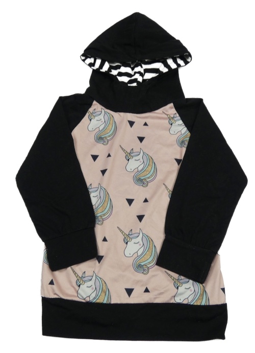 Světlerůžovo-černá slabá mikina s jednorožci a kapucí