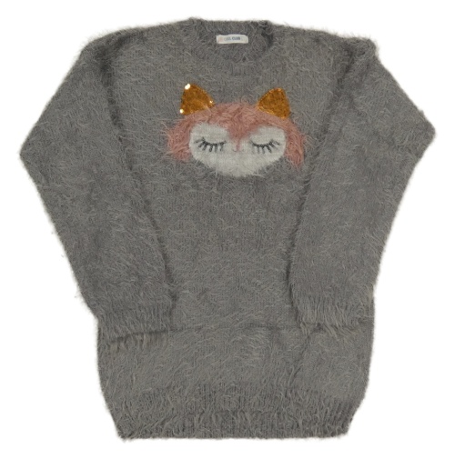 Šedý chlupatý dlouhý svetr s liškou a flitry Cool Club