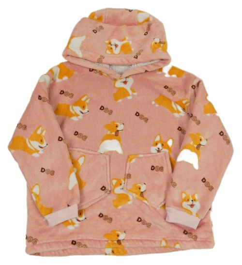 Růžová teplá plyšová domácí mikina s kapucí a pejsky