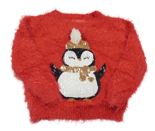 Červený chlupatý svetr s tučňákem z flitrů Primark