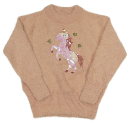 Meruňkový chlupatý svetr s jednorožcem z flitrů
