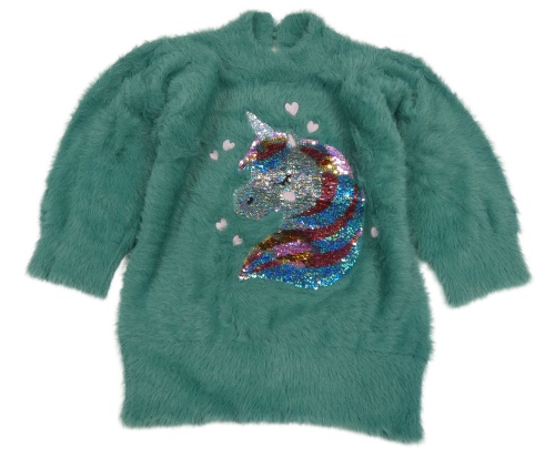 Olivový chlupatý svetr s jednorožcem z překlápěcích flitrů a srdíčky