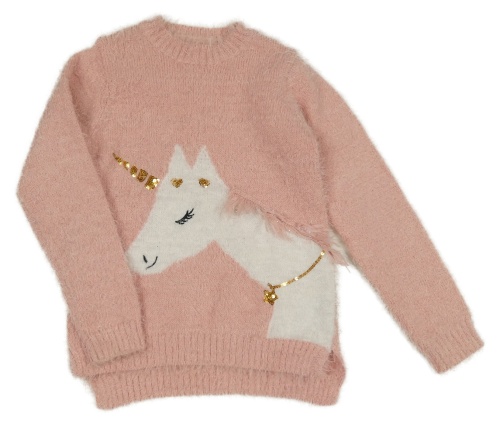Růžový chlupatý svetr s jednorožcem s flitry St. Bernard