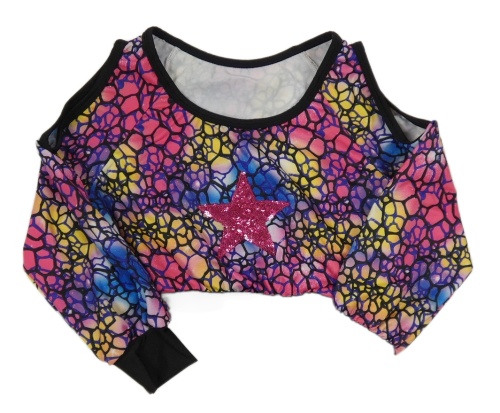 Barevno-černé vzorované sportovní crop mikinotriko s hvězdou z flitrů a volnými rameny