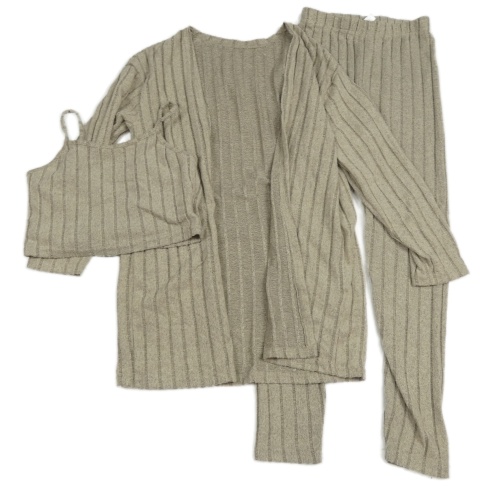 3Set - Béžovo-šedý melírovaný žebrovaný úpletový cardigan + kalhoty + crop top SHEIN