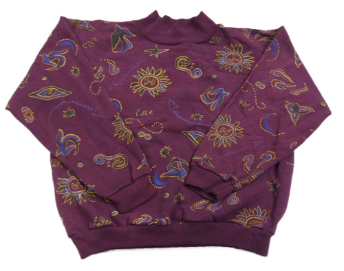 Fialová oversize mikina se sluníčky a ptáčky